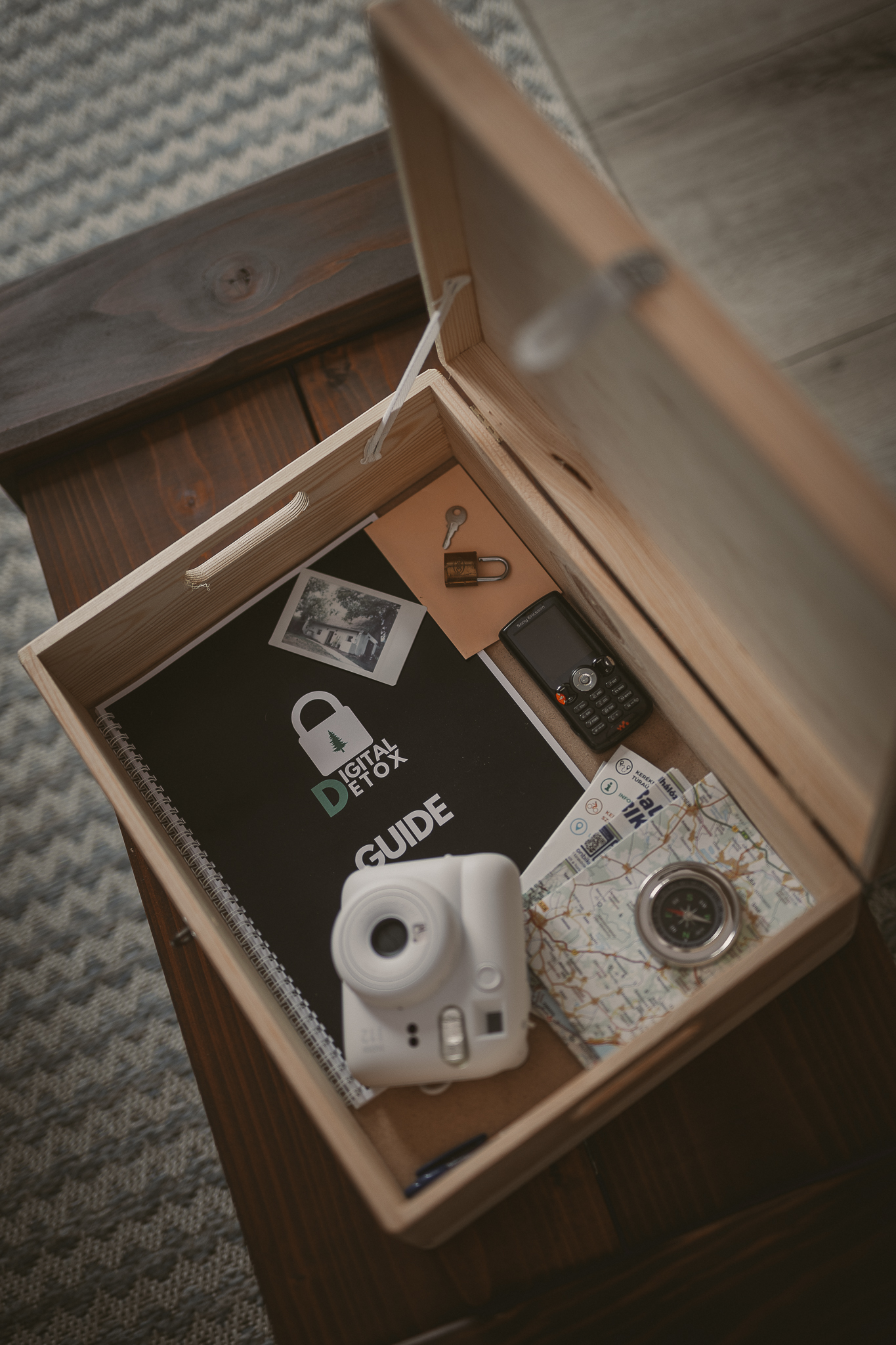 Amikor megérkeztek be lesz készítve a Digital Detox Box. Ebben vannak az eszközök, amiket tudsz használni az ittléted alatt és ide kell majd elzárni a telefonotokat.